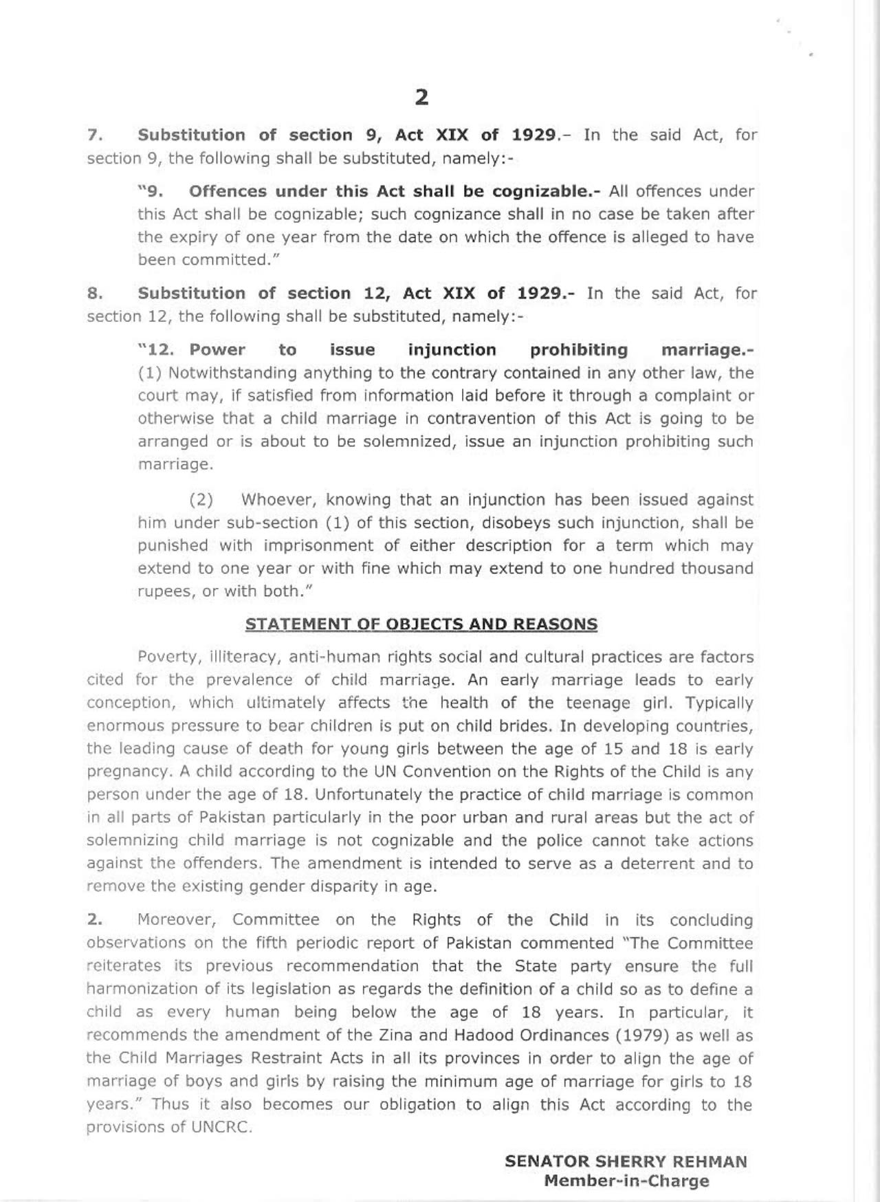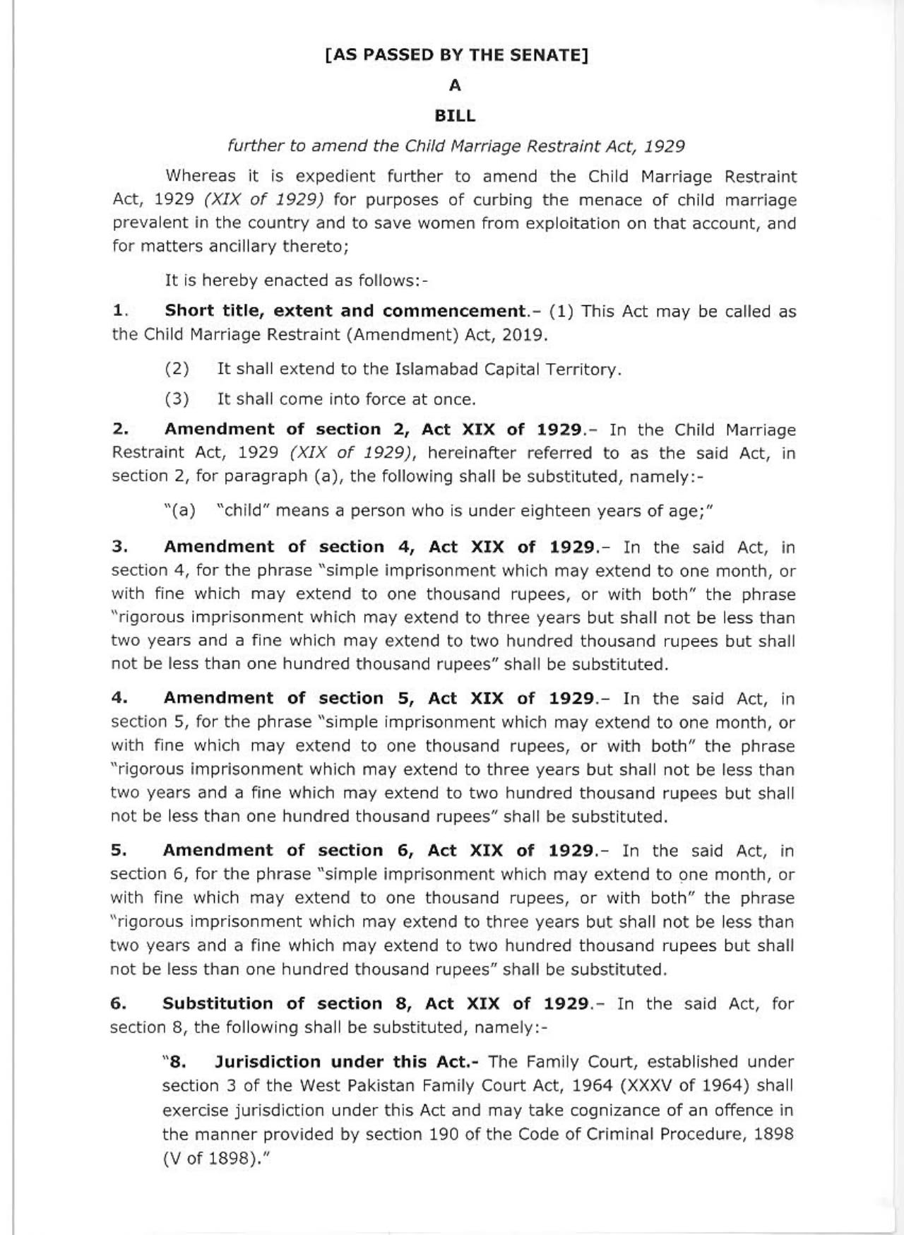 Child Marriage Act (Amendment) Bill Presented in Senate 2018-2019